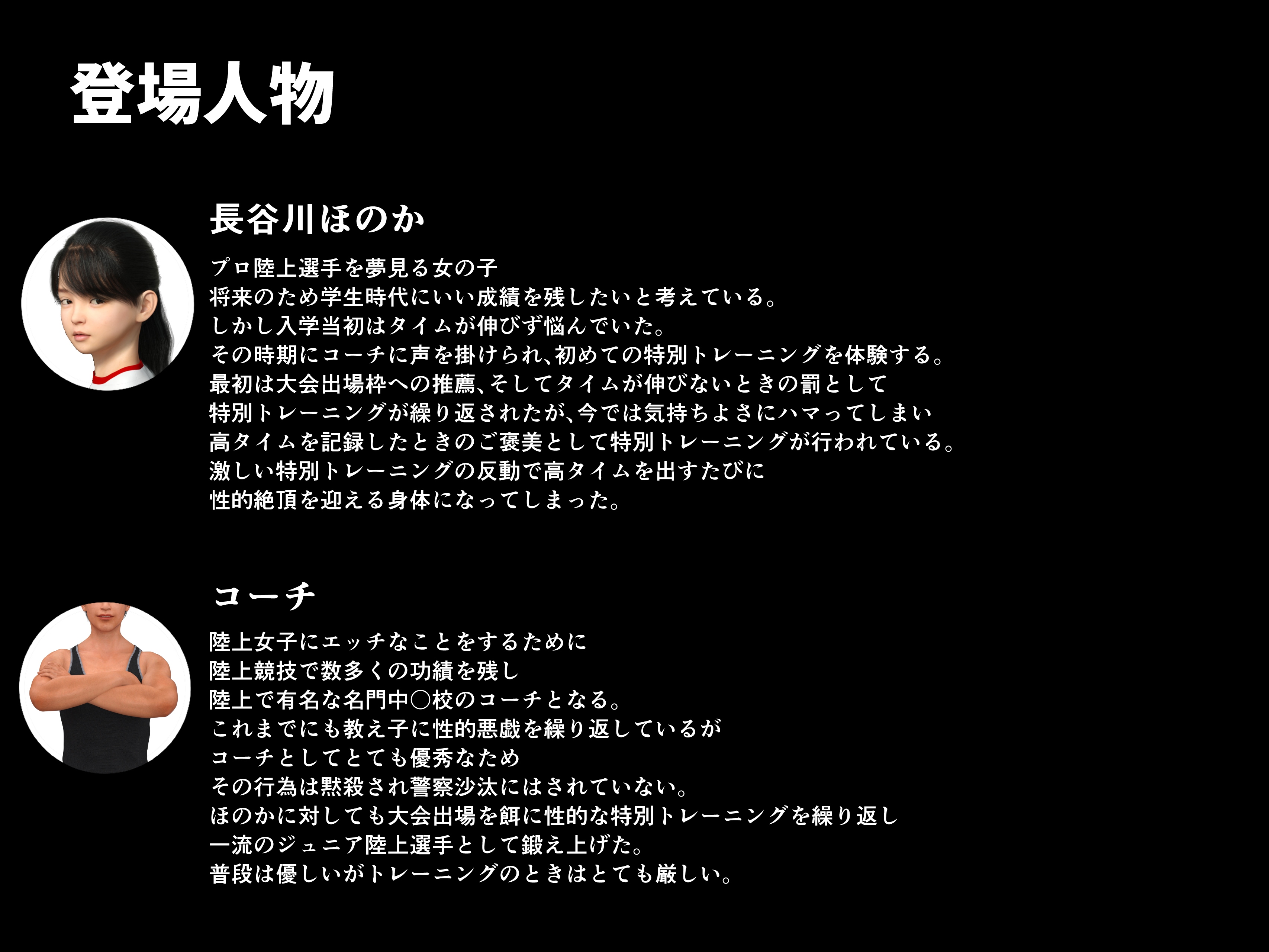 逆らえない少女をコーチという立場を利用し、己の性欲処理に使用し、Hな女の子に仕上げるというコーチのクズさを感じていただければと思います。