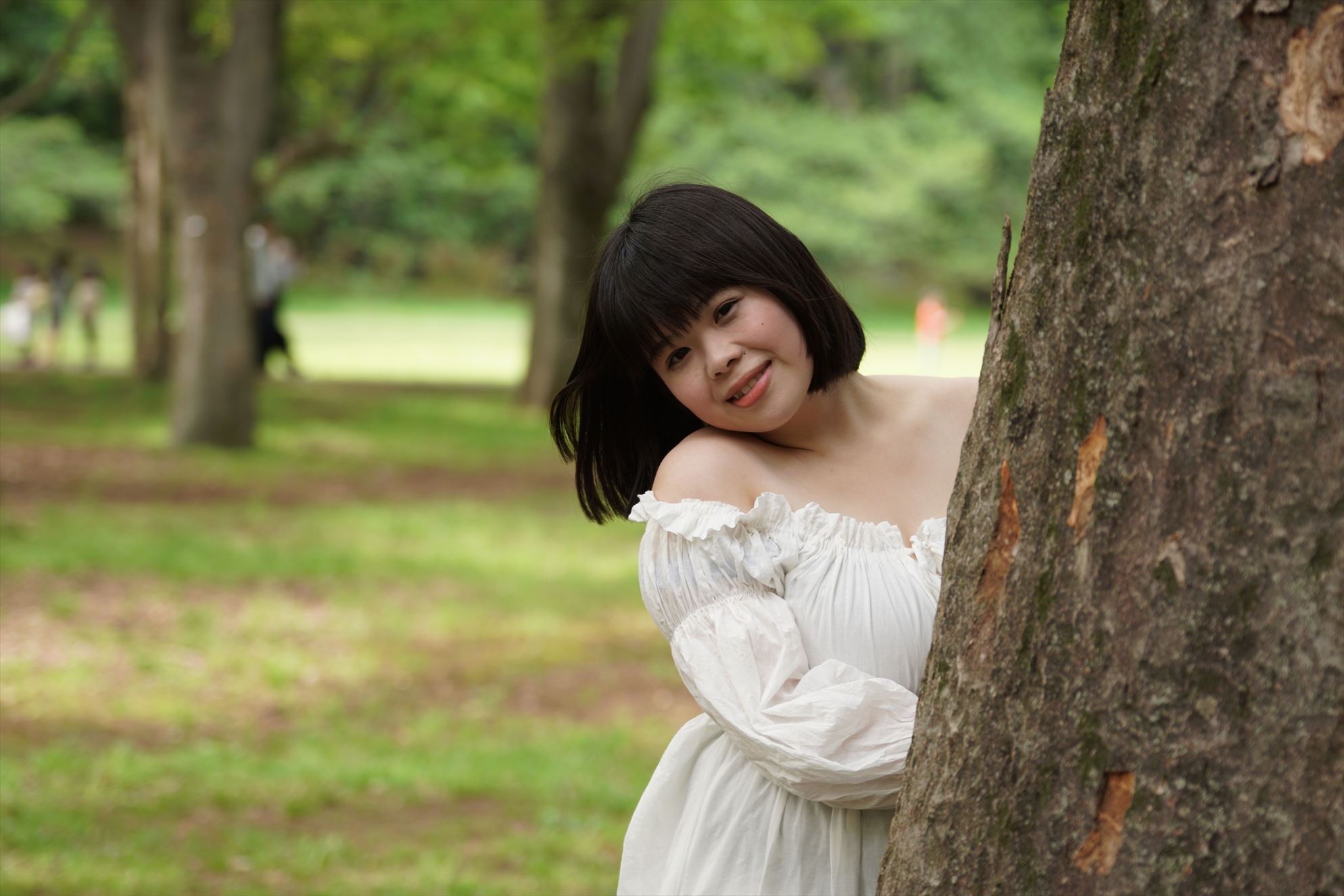 緑の中で白い服